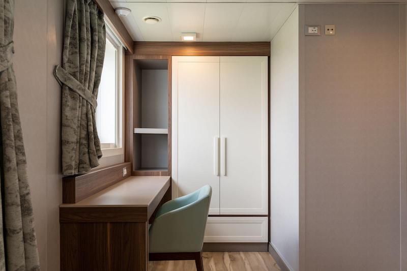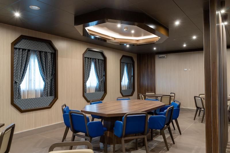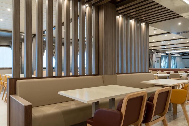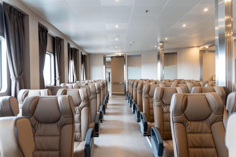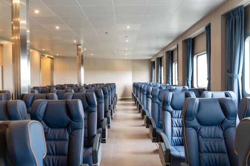 Dispone de acomodación para 604 pasajeros en 151 camarotes cuádruples más otros cuatro camarotes clase Premium y dos camarotes para pasajeros de movilidad reducida (PMR), así como tres salas de butacas tipo pullman para 189 pasajeros y una de ellas clase VIP, recepción, zona comercial, food-lounge autoservicio, dos zonas lounge bar, guardería, conexión wi-fi, así como una amplia terraza en la cubierta 7 y otros servicios.