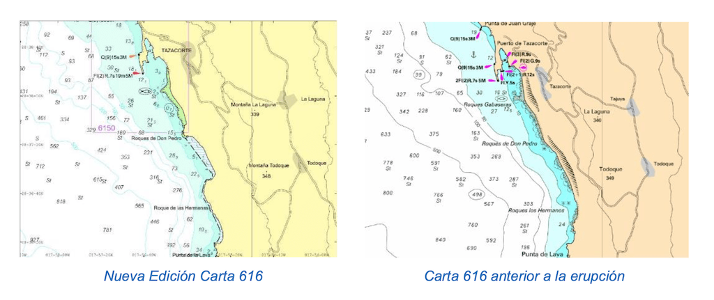 A diferencia del anterior episodio, la erupción del volcán Tajogaite, que comenzó en septiembre de 2021 en la vertiente occidental de la isla de La Palma, no solamente modificó la batimetría costera, sino también la línea de costa, por lo que, tras finalizar los episodios eruptivos y estabilizarse los procesos dinámicos asociados, se hizo necesario efectuar diferentes trabajos en la mar y en tierra para publicar una nueva edición de la carta 616.