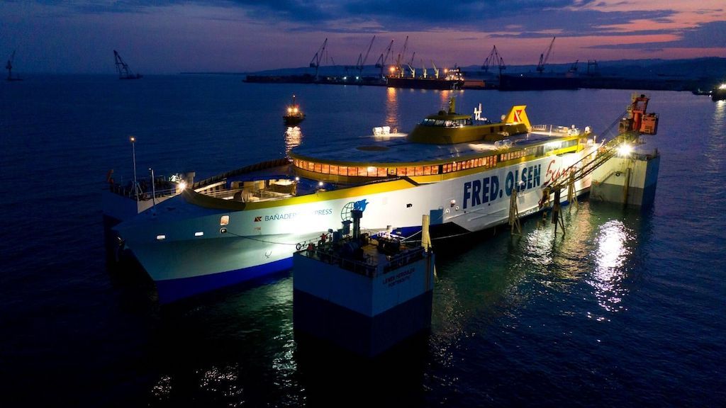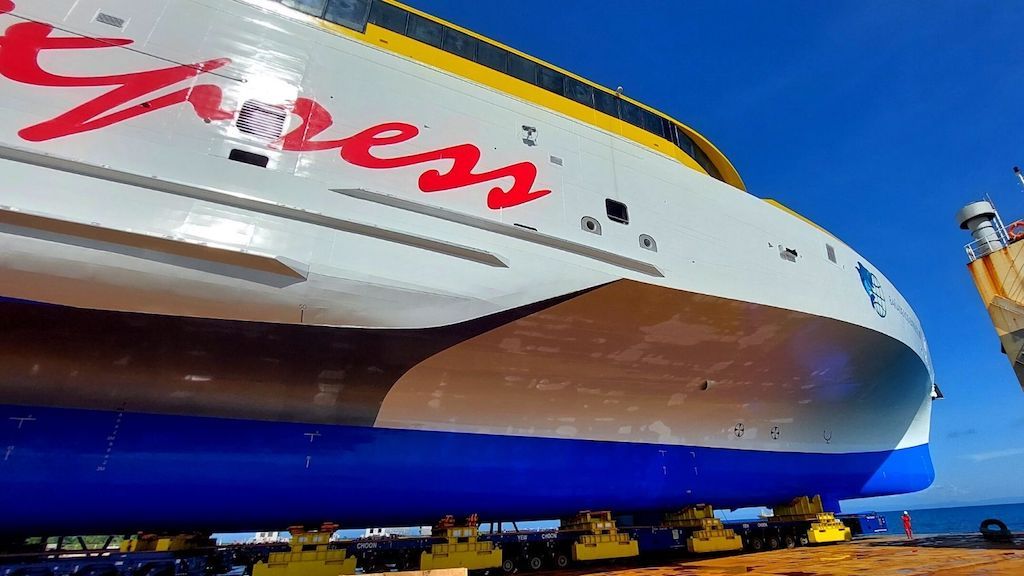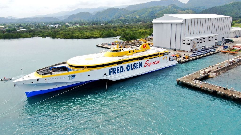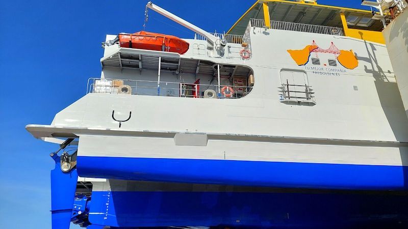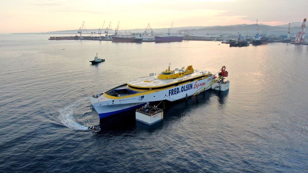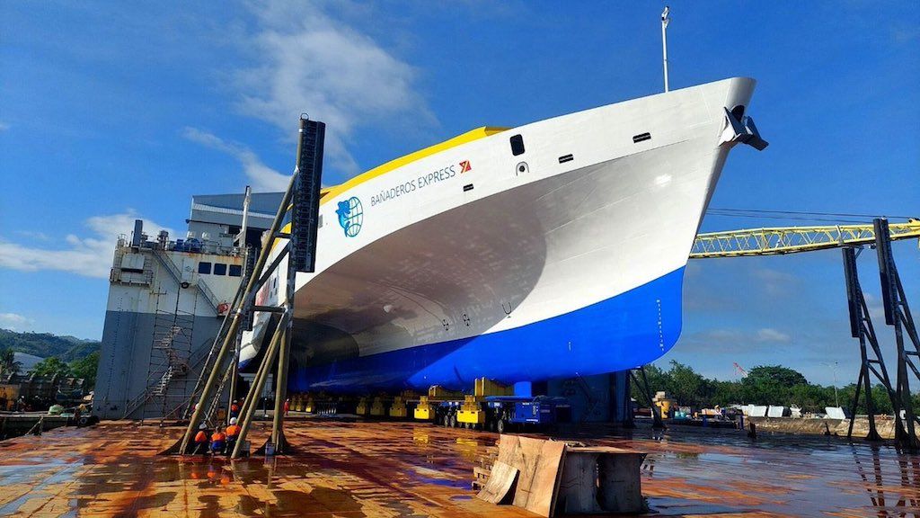 El astillero Austal Filipinas ha puesto a flote el trimarán “Bañaderos Express”, cuya entrega se producirá en mayo próximo, de modo que pueda estar operativo este verano en Canarias. Gemelo del buque “Bajamar Express”, se trata de una versión mejorada del prototipo “Benchijigua Express”. Estará propulsado por cuatro motores principales MTU 8000 de 9.100 kW de potencia cada uno, fiables tanto en su eficiencia energética como en potencia. Cumple con las normativas internacionales en cuanto a nivel de emisiones de NOx y tiene una capacidad para 1.100 pasajeros y 276 automóviles a una velocidad máxima de 38 nudos.