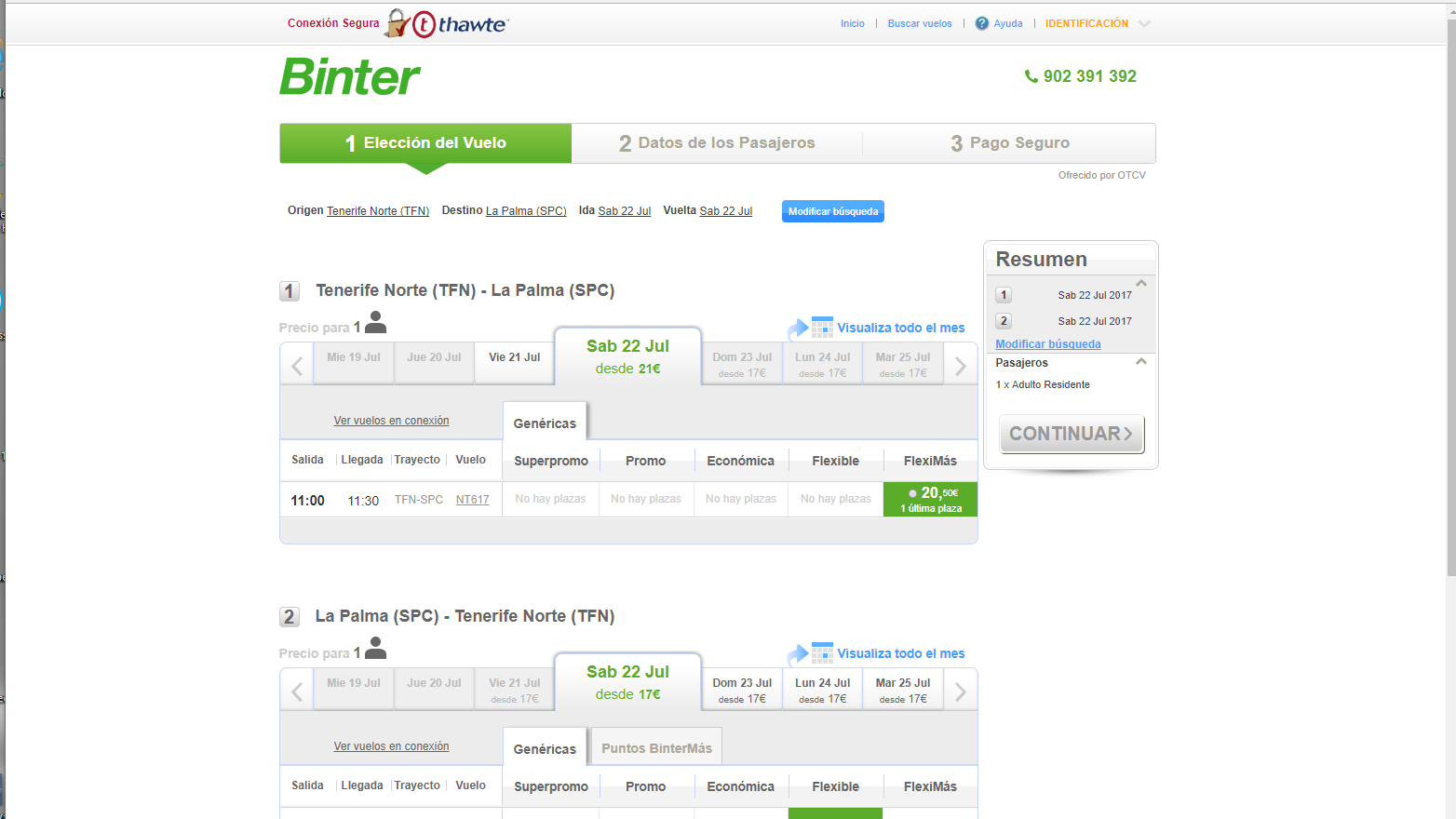 No dudamos que el aumento del descuento al 75% beneficia generosamente al residente canario (léase, también, balear), cuanto la incapacidad de las aerolíneas regionales canarias para atender la demanda. Pongamos un ejemplo. Supongamos que mañana, sábado 22 de julio, surge una urgencia para un pasajero que necesita viajar entre Tenerife Norte y La Palma. Se va a llevar la desagradable sorpresa de que la “competencia” de Canaryfly no tiene plazas en ningún vuelo y que la “maravillosa” Binter sólo tiene una plaza disponible a las 11 h. Adjuntamos capturas de pantalla, a los efectos oportunos.