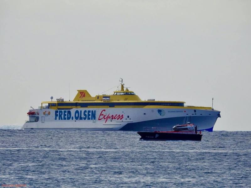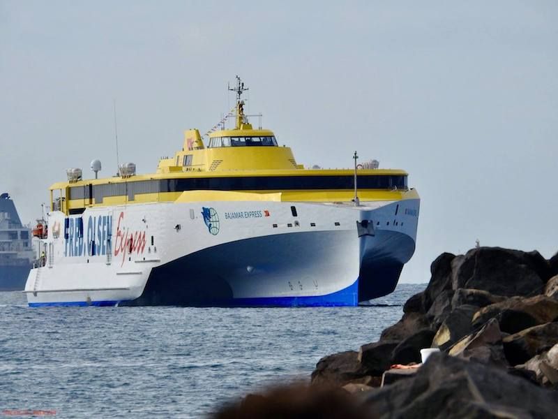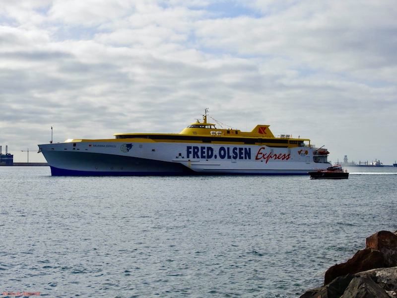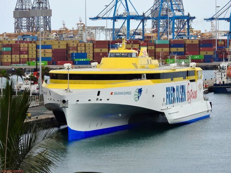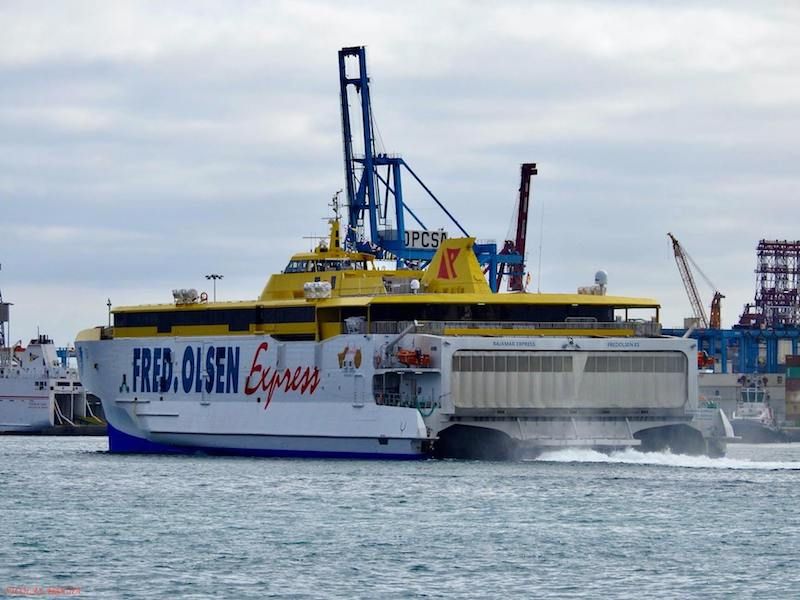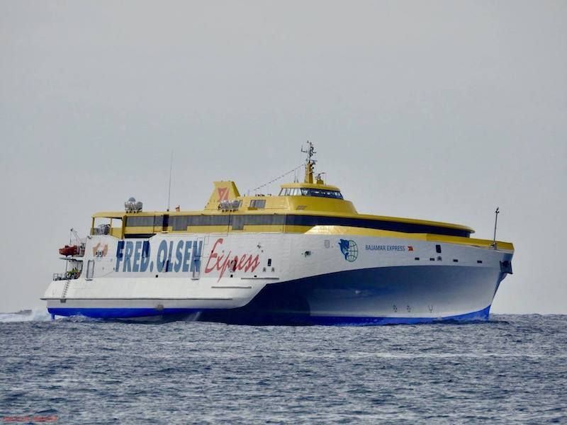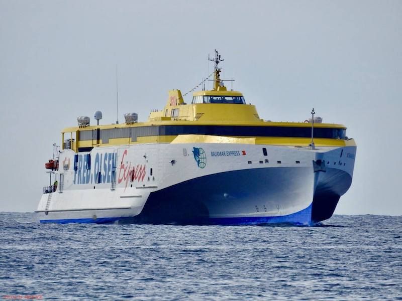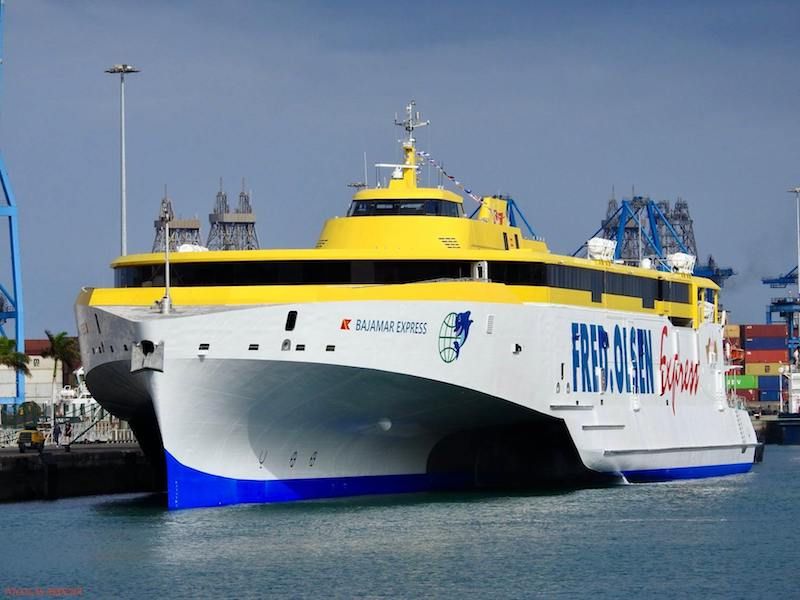Fred. Olsen anuncia que el trimarán “Bajamar Express” entrará en línea el próximo 10 de agosto entre Gran Canaria y Tenerife. Tiene capacidad para 1.100 pasajeros, 276 automóviles y puede mantener una velocidad de 36 nudos.