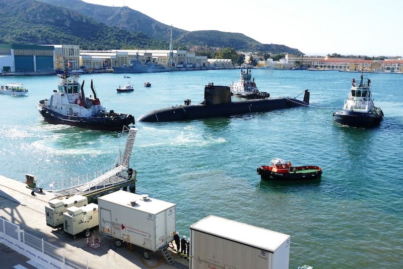 Los remolcadores “VB Brío”, “VB Aníbal” y “VB Asdrúbal”, de la flota de Boluda Towage Spain con base en el puerto de Cartagena, intervinieron esta tarde en la maniobra de puesta a flote del submarino S-81 “Isaac Peral”, tras su salida del dique flotante. Intervinieron también varias unidades del Tren Naval del Arsenal de Cartagena, todos ellos bajo la dirección de un grupo de prácticos de la Corporación del citado puerto. La maniobra se desarrolló con gran precisión y el submarino quedó atracado babor al muelle de armamento, donde proseguirán los trabajos hasta que comience el calendario de pruebas de mar.