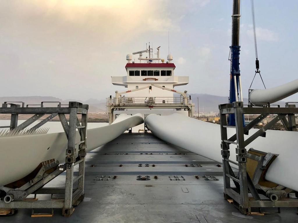 En este caso concreto, los componentes del aerogenerador fueron trasladados posteriormente en camiones a la zona de acopio en Arinaga para su traslado final a Roque Prieto, al norte de Gran Canaria. Estos componentes forman parte del modelo E-103, cuyo diámetro del rotor es de 103 metros, siendo la longitud de cada pala de 49,80 metros de largo.