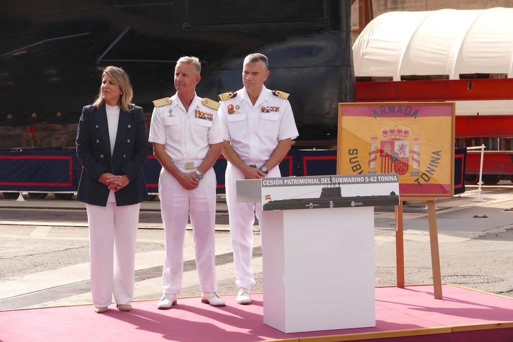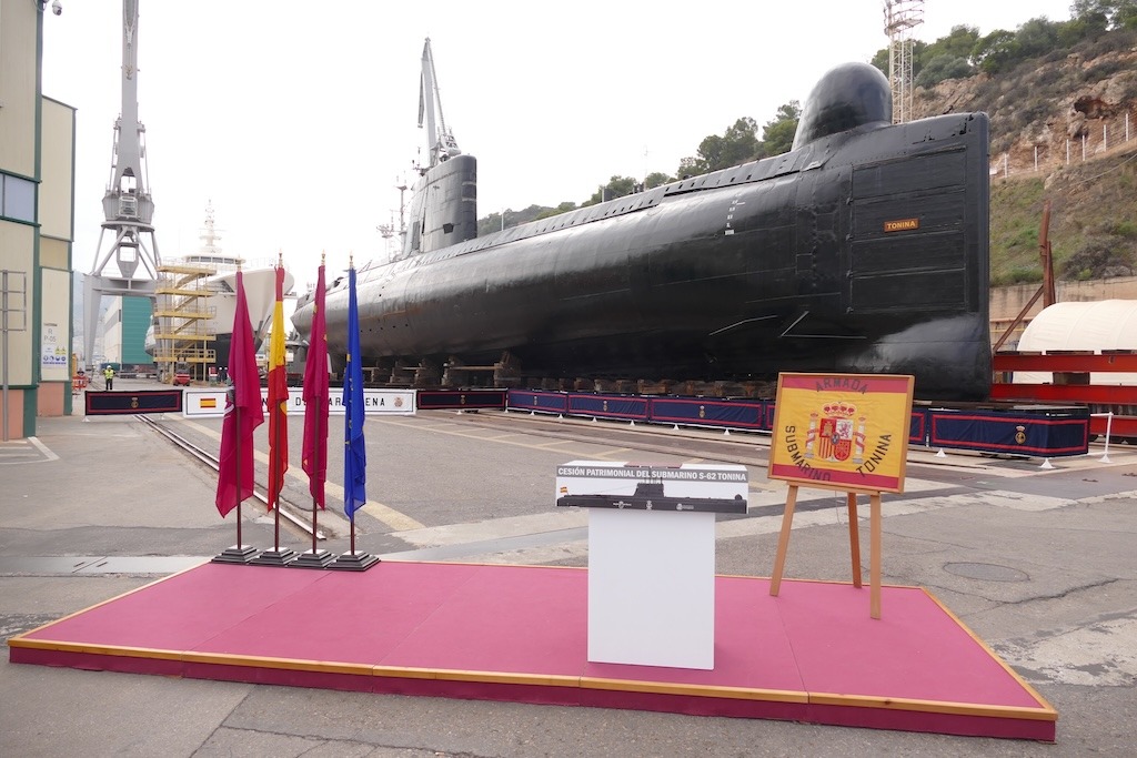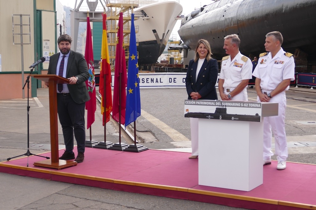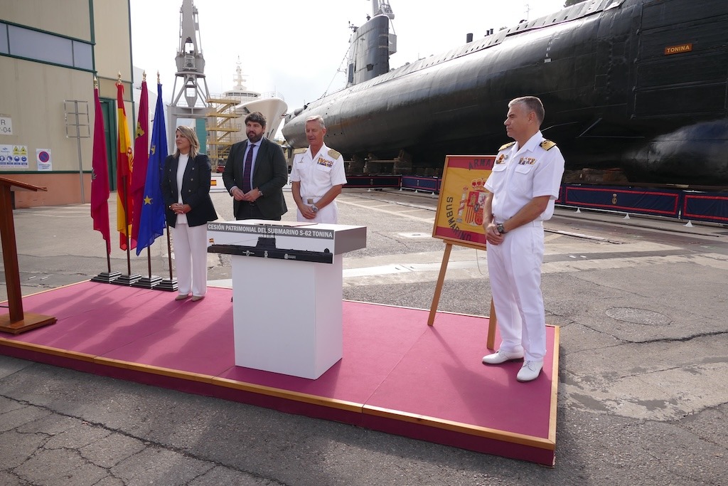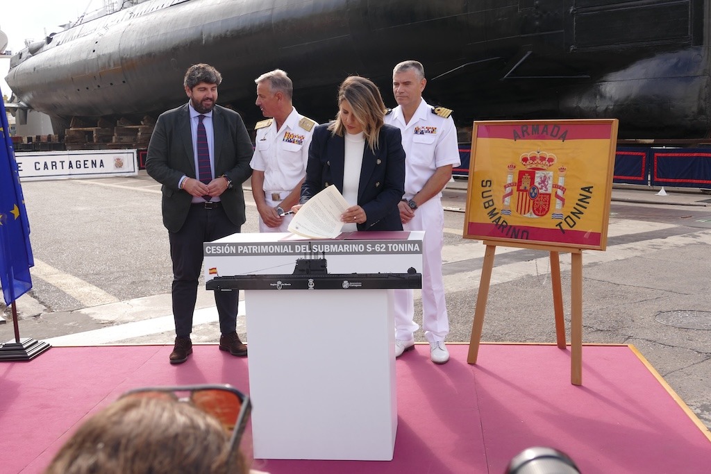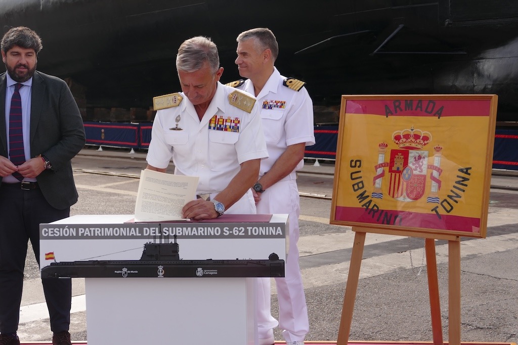 El submarino S 62 “Tonina” pertenece desde hoy a la ciudad de Cartagena, tras la cesión patrimonial oficial, mediante convenio, por parte de la Armada. Un paso importante en el largo camino hacia su musealización del sumergible que sobrevive a la intemperie desde hace años en el astillero de Navantia Cartagena.