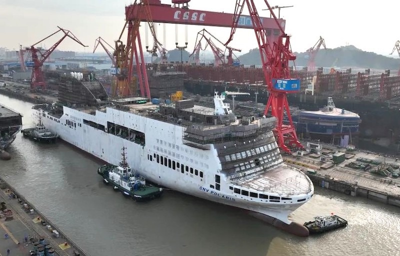 El astillero CSSC Guanzhou ha puesto a flote el buque ropax “GNV Polaris”, primero de dos unidades del mismo proyecto contratadas por la compañía italiana filial de MSC. Prevista su entrega para el último trimestre de 2024, tiene capacidad para 1.500 pasajeros y un garaje de 3.100 metros lineales de carga rodada.