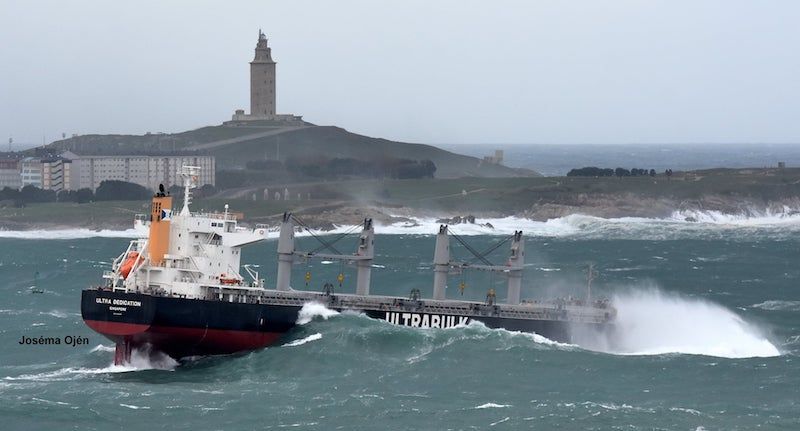 Consecuencia de la situación meteorológica descrita se producen imágenes como la que acompaña, captada por el fotógrafo Joséma Ojén León, del buque “Ultra Dedication” (IMO 9790866), abanderado en Singapur, a su salida del puerto de A Coruña. Un buen meneo antesala de lo que serán las próximas horas de navegación a mar abierta, cuando la mar no es mansa, precisamente.