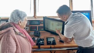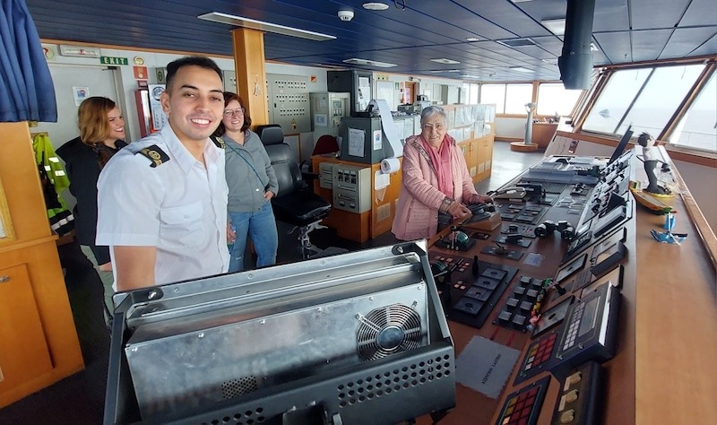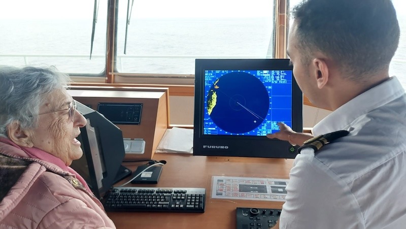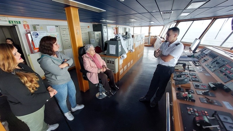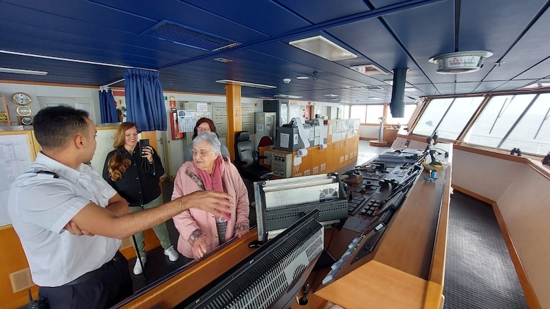 Atendida por el segundo oficial de cubierta Anouar Arbhi y el jefe de máquinas Marcelo González, doña María Carmela Lirio Ramón recibió todo tipo de explicaciones sobre la navegación y el funcionamiento y cometido de los diversos equipos y sistemas de que dispone el buque y ella preguntó todo cuando quería saber y agradeció emocionada las atenciones recibidas.