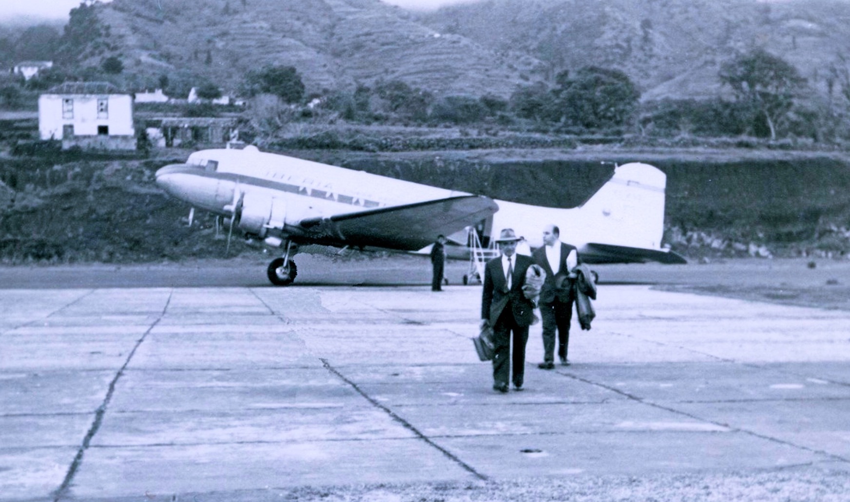 En la foto del archivo de Miguel Bravo vemos a unos pasajeros tras bajarse del avión DC-3 de Iberia que los había traído desde Tenerife. Viajar en avión, entonces, era un lujo. Nada que ver con el transporte aéreo actual. Las tornas se han cambiado. En aquel tiempo, el transporte marítimo era el medio más económico y el avión el más caro. Hoy, con jugosas subvenciones de por medio, avión y barco son indiscutibles protagonistas del transporte con La Palma.