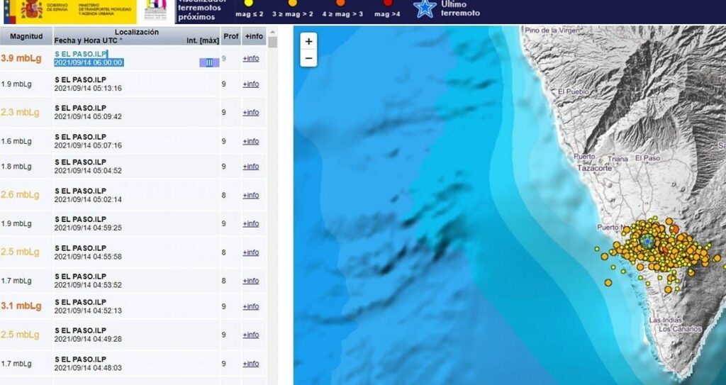 Hasta el momento se han detectado 2.935 movimientos sísmicos en la zona sur de la isla –de los cuales se han localizado 616–, correspondiente al edificio volcánico de Cumbre Vieja, donde en los últimos 500 años se han producido seis erupciones históricas (1585, 1646, 1677, 1712, 1949 y 1971) y otra poco antes de la conquista de la isla, que corresponde al volcán de Tacande.