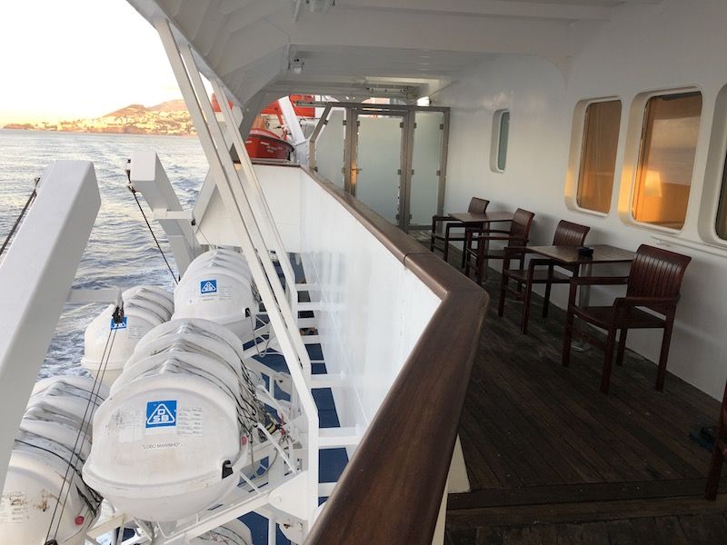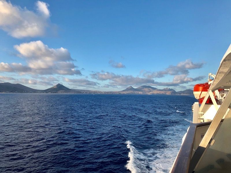 Una travesía agradable que se convierte en la mejor opción para llegar a Porto Santo, en la que 40 minutos de viaje transcurre placenteramente al resguardo del sur de la isla, en cuyo recorrido se puede admirar la extraordinaria obra de ingeniería de la ampliación del aeropuerto insular, con el tablero de la pista de vuelo sustentada sobre impresionantes columnas en terrenos ganados al mar. Después de una hora a mar abierta, el barco alcanza el resguardo de Ilhéu da Cal y Caletha y atraca en el pequeño puerto insular, que es de factura moderna.