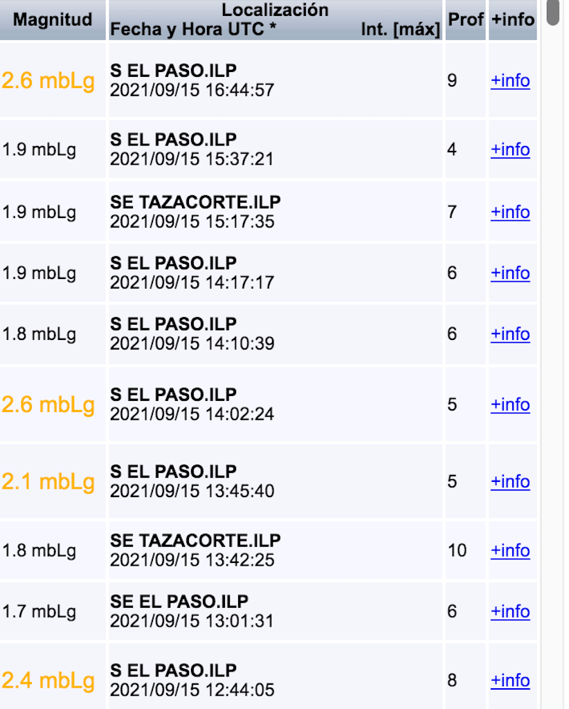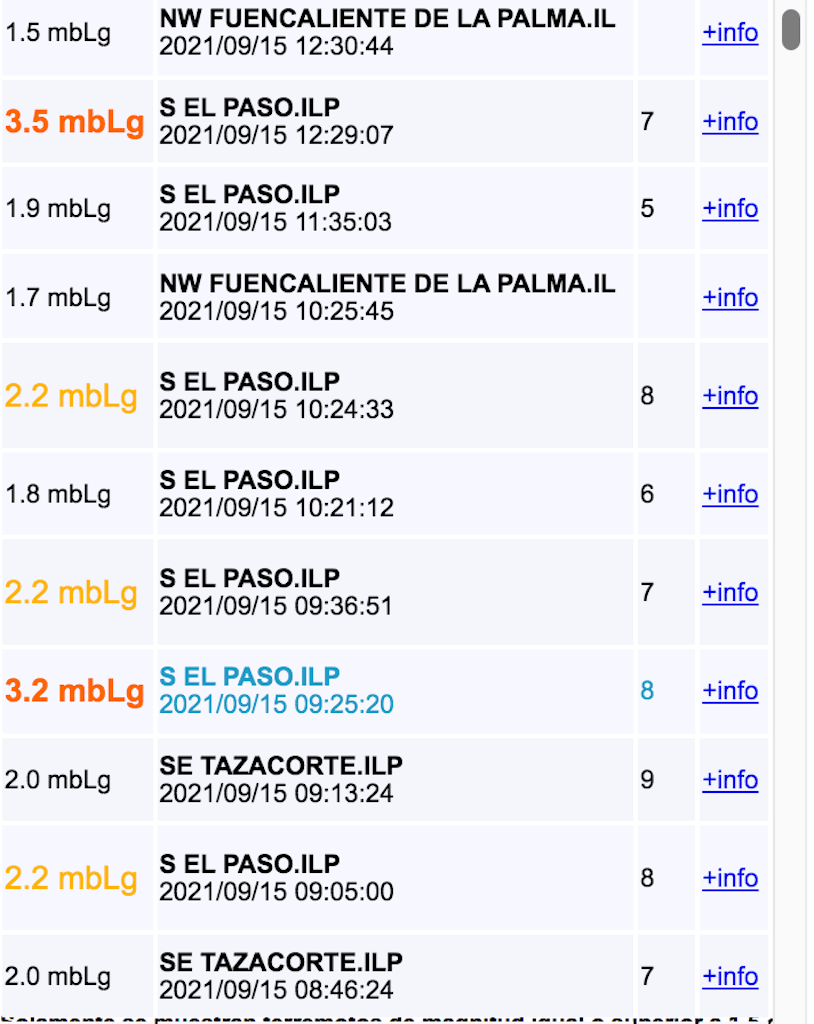 Continúa el enjambre sísmico en el volcán Cumbre Vieja (La Palma, Islas Canarias) con casi un millar de terremotos localizados de baja magnitud, informa INVOLCAN. Los hipocentros se encuentran bajo el volcán de Cumbre Vieja generalmente a profundidades de entre 9 y 12 kilómetros, aunque hoy miércoles hay algunos terremotos localizados a una profundidad de entre 1 y 3 kilómetros, como se puede ver en la relación del IGN (abajo). La magnitud máxima observada hasta ahora ha sido de 3,4 en la escala Richter.