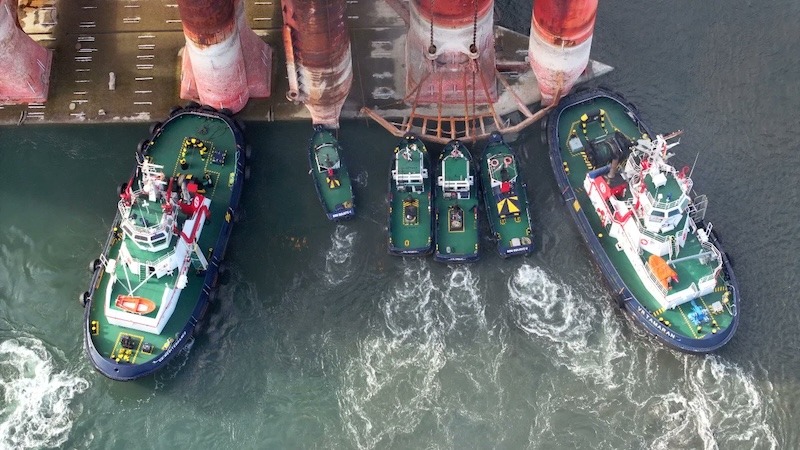 Una vez se alcanzó un calado compatible para el atraque de la plataforma en el muelle Norte de Astican, se procedió a la maniobra de entrada al muelle gracias a la intervención de ocho remolcadores, dos prácticos y una docena de amarradores y de buzos.