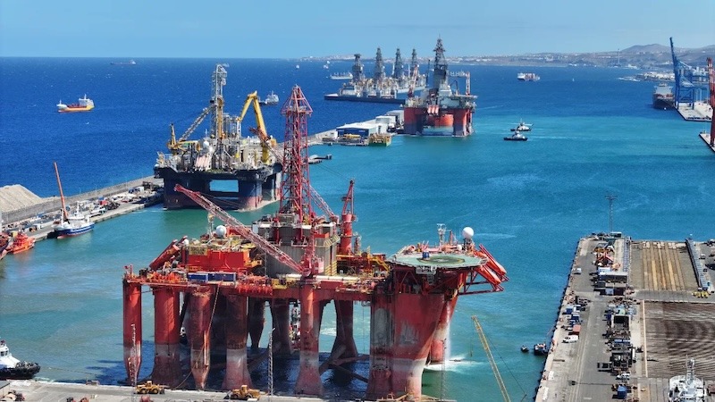 Dos plataformas petrolíferas se suman estos días a la foto del skyline del puerto de Las Palmas de Gran Canaria. Se distinguen de las habituales por su color rojo, frente al gris de las cinco que permanecen desde hace años atracadas a lo largo del muelle Reina Sofía — varias de las cuales fueron “expulsadas” del puerto de Santa Cruz de Tenerife, en una política comercial que se ha demostrado claramente errónea— y por su estructura con patas, frente a los buques perforadores.