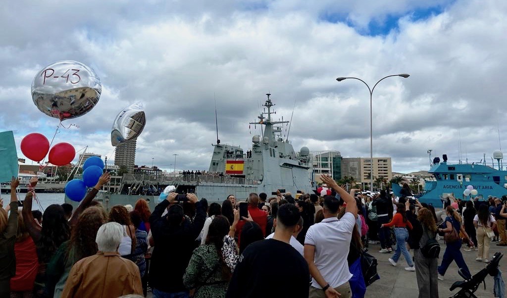 El almirante comandante del Mando Naval de Canarias, contralmirante José Lago Ochoa, presidió hoy el recibimiento del BAM “Relámpago” (P-43), después de un despliegue de casi cuatro meses en aguas del Golfo de Guinea y la costa occidental de África. La dotación formada por 85 personas pudo abrazarse con sus familiares en un emotivo encuentro a pie de muelle y podrán disfrutar de las Navidades en casa.
