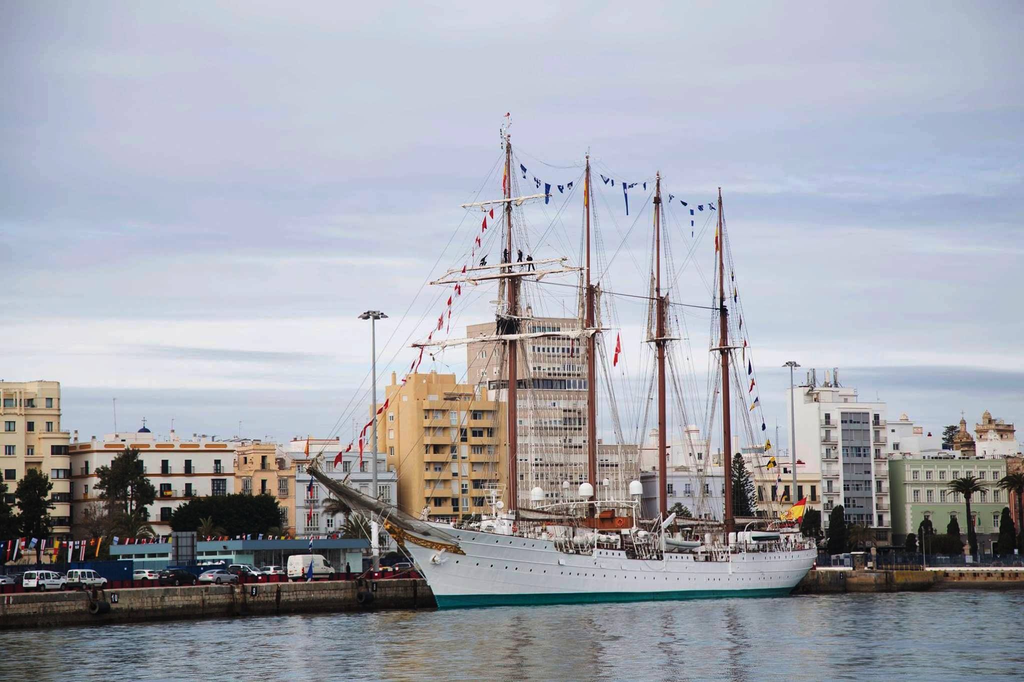 El buque-escuela español, que cumple 90 años, deja Cádiz en plenos Carnavales y será despedido por las máximas autoridades de la Armada, entre ellas el AJEMA, almirante general Teodoro López Calderón; autoridades civiles, familiares, amigos y los miembros del colectivo “Cádiz con Elcano”, que trata de resaltar el protagonismo del buque construido en el astillero Echevarrieta y Larrinaga.