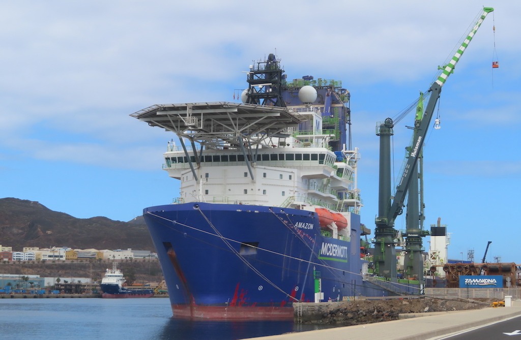 Construido como buque off shore y reconvertido en cablero para el tendido de tuberías en alta mar, el buque “Amazon” (IMO 9698094) se encuentra atracado en el puerto de Las Palmas de Gran Canaria, en un periodo de mantenimiento y modificación de equipos. Un proceso que requiere mucho trabajo, suministros y mano de obra especializada, de modo que el buque esté preparado para su próxima campaña.