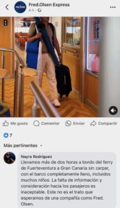 Nayra Rodríguez, pasajera del “Barlovento Express”, resume la situación que se vivía a bordo del catamarán “Barlovento Express” y escribe que “llevamos más de dos horas a bordo del ferry de Fuerteventura a Gran Canaria sin zarpar, con el barco completamente lleno, incluidos muchos niños. La falta de información y consideración hacia los pasajeros es inaceptable. Este no es el trato que esperamos de una compañía como Fred. Olsen”.