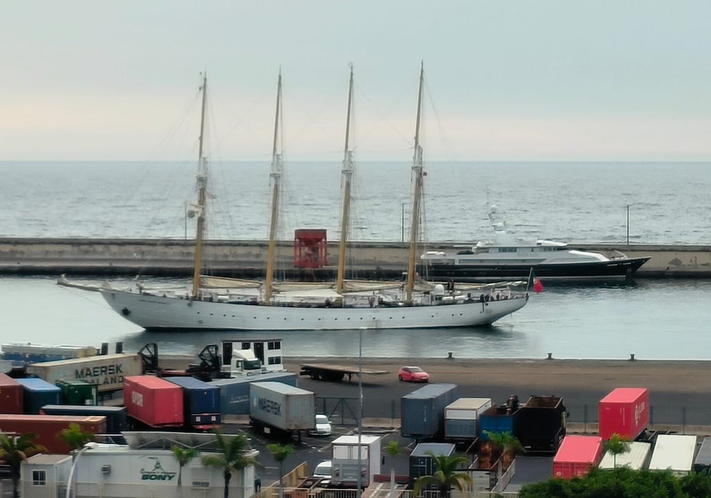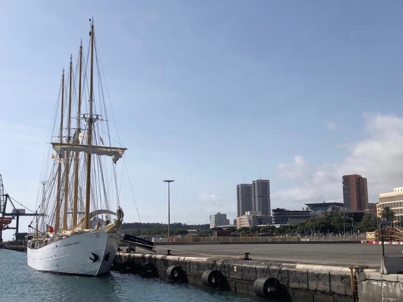 De nuevo en el puerto de Santa Cruz de Tenerife, la gracia y la elegancia del lugre portugués “Santa María Manuela”, uno de los últimos barcos de su clase dedicados a la pesca del bacalao y desde hace unos años buque-escuela del Grupo Jerónimo Martins –su gemelo “Creoula” pertenece a la Armada de Portugal–, donde comparte atraque con varios veleros históricos y algunos yates.