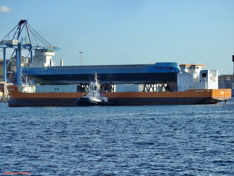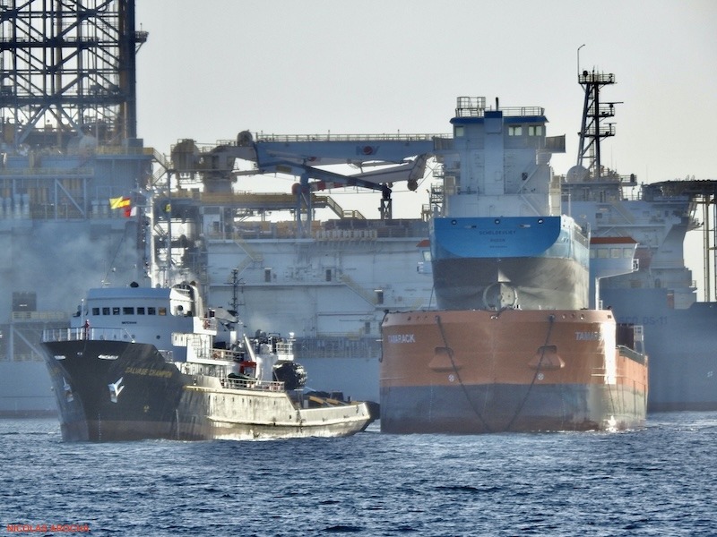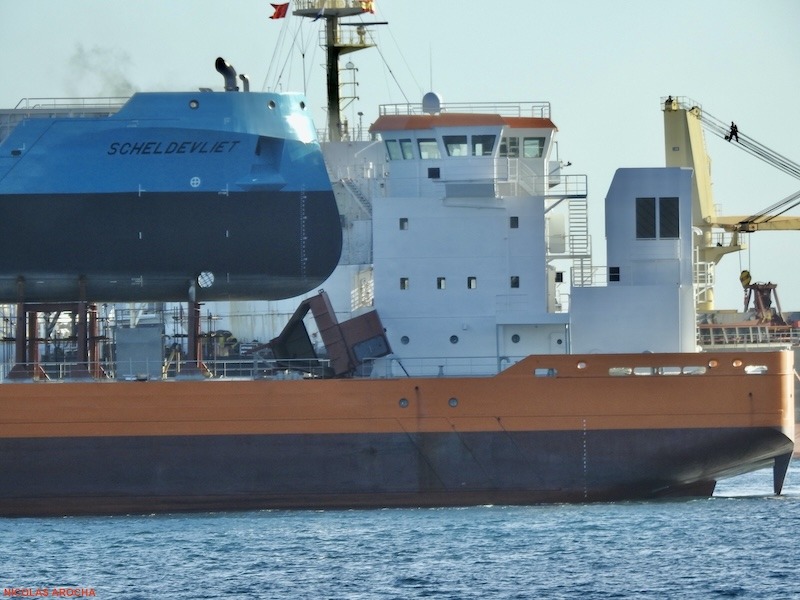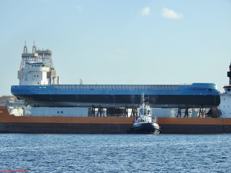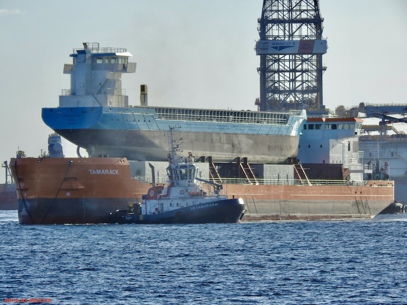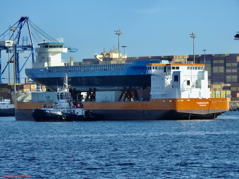 A remolque del remolcador “Salvage Champion”, se encuentra en el puerto de Las Palmas de Gran Canaria el remolque de dos buques, uno encima del otro, como muestra el reportaje fotográfico de nuestro colaborador Nicolás Arocha. El remolcador remolca al buque “Tamarak”, que tiene matrícula de Toronto (Canadá) y sobre este se encuentra el buque “Scheldevliet”. El remolque viene desde Taiwán y va camino de Países Bajos.