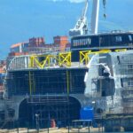 En las fotos de Aquiles Garea vemos el estado de construcción del catamarán que se encuentra en la grada de la factoría de Gijón de Astilleros Armón, a seis meses de su entrega, que es el retraso que lleva el proyecto, afectado en parte por la crisis sanitaria del coronavirus. Se prevé que esté terminado para finales de este año o comienzos de 2021 y se habla de la posibilidad de un segundo buque del mismo tipo, condicionado a la financiación, la evolución del mercado y el comportamiento operativo del nuevo fast-ferry.