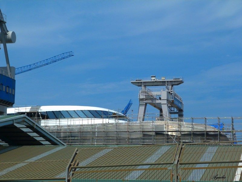 En las fotos de Aquiles Garea vemos el estado de construcción del catamarán que se encuentra en la grada de la factoría de Gijón de Astilleros Armón, a seis meses de su entrega, que es el retraso que lleva el proyecto, afectado en parte por la crisis sanitaria del coronavirus. Se prevé que esté terminado para finales de este año o comienzos de 2021 y se habla de la posibilidad de un segundo buque del mismo tipo, condicionado a la financiación, la evolución del mercado y el comportamiento operativo del nuevo fast-ferry.