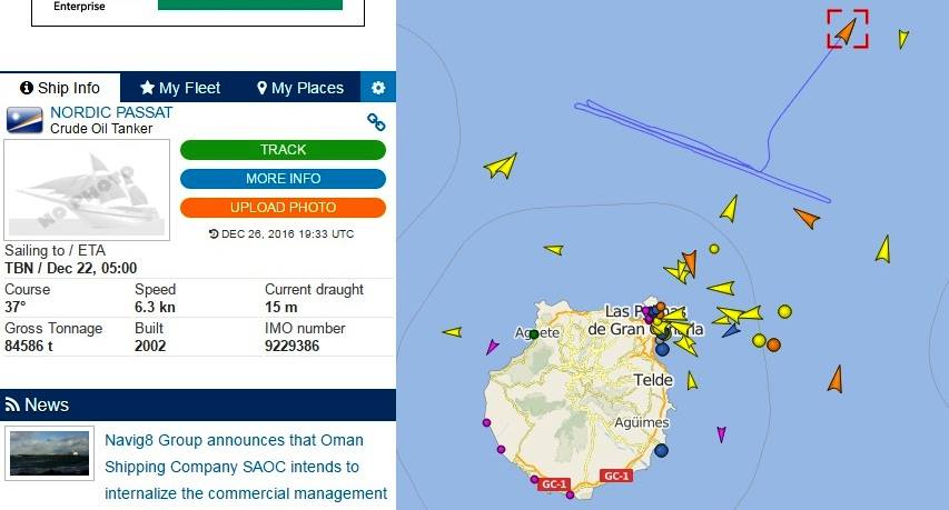 Después de algo más de tres días de permanencia a unas 20 millas al noreste de Gran Canaria, el petrolero “Nordic Passat” está siendo remolcado en dirección norte tras la estela del remolcador “Salvanguard”. Cuando navegaba en el canal de tránsito entre las islas de Tenerife y Gran Canaria, una avería en el motor principal determinó la decisión del capitán de dirigirse al puerto grancanario para su reparación, pero se ha encontrado con que no dispone de atraque.