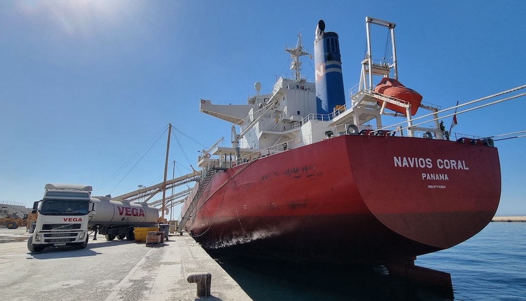 El bulkcarrier de bandera panameña “Navios Coral”, atracado en el Puerto de Almería, embarca esta semana 82.000 toneladas de yeso. Se trata de la mayor carga histórica registrada en la dársena almeriense. La operación, que se ha iniciado hoy en el Muelle de Pechina, está a cargo de la consignataria SA López Guillén.