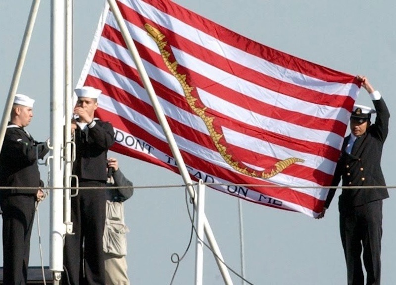 Estados Unidos, por su parte, utilizó hasta septiembre de 2002, la que llamaban la “Unión Jack”, que venía a ser el trozo rectangular de su bandera nacional, donde lucen tantas estrellas como Estados tiene el país, pero desde esa fecha, fue sustituida por otra dada en llamar la “First Navy jack”, con trece líneas horizontales (7 rojas y 6 blancas) y una serpiente de cascabel en diagonal, con la leyenda “Don´t tread on me”, que traducido literalmente viene a significar “No me pises”, o dicho de otro modo, lo que una serpiente diría si hablara, “no me provoques, que me puedo revolver contra tí….”, y cuyo diseño está basado en el empleado por la Armada continental durante la Guerra de la independencia de los Estados Unidos.