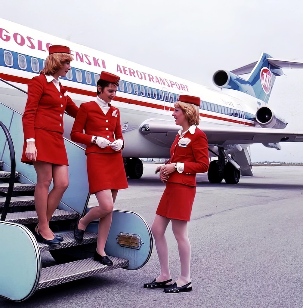 Resulta interesante esta foto en color y poco convencional que nos permite conocer los uniformes de las TCPs de la aerolínea yugoslava JAT, al pie de la escalerilla de un avión Boeing B-727, en una imagen de 1986. Pese a la influencia del bloque soviético, JAT operó un número importante de aviones occidentales y entre ellos nueve Boeing B-727-200, de los cuales los dos primeros le fueron entregados en 1974.
