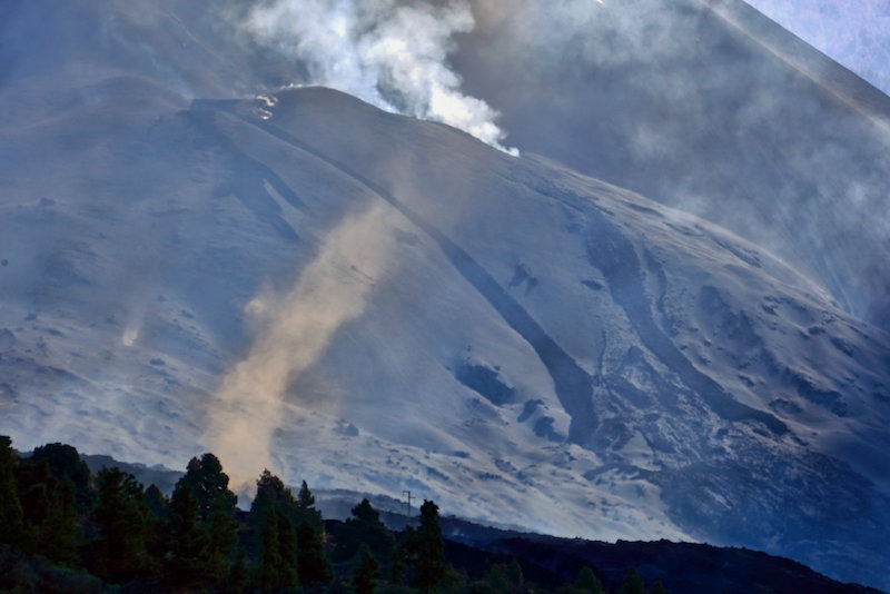Ayer, mientras los conos secundarios mostraban una notable actividad tras la apertura de dos nuevas bocas, el cono principal se tomó un descanso e hizo ver a algunos que igual había llegado el final eruptivo de ese protagonista, pero nada más lejos de la realidad. El volcán tiene piel de cordero, pero es un lobo desmedido. Desde esta mañana muestra su poderío en una actividad intermitente de la actividad estromboliana combinada con pulsos freatomagmáticos.