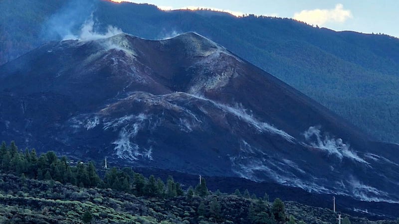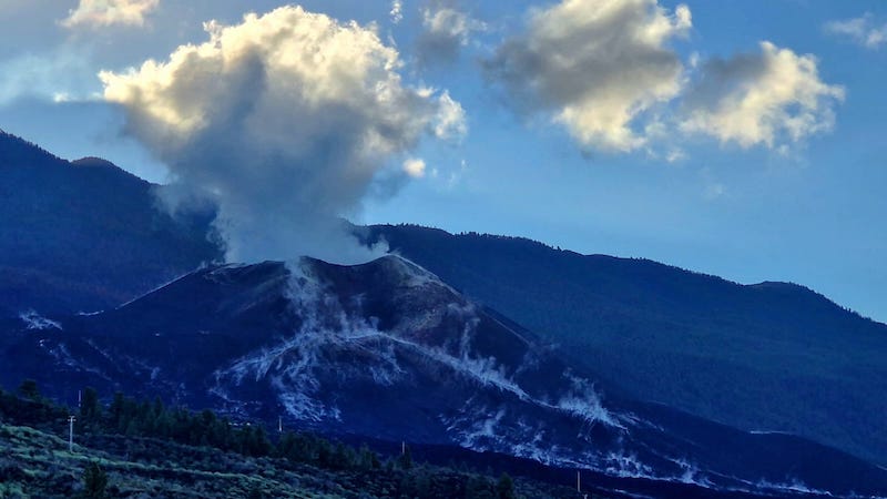 Las lluvias que han descargado en las últimas horas sobre la isla de La Palma y, especialmente, en el valle de Aridane, han contribuido a esta imagen del volcán Tajogaite, que ha captado esta mañana el fotógrafo palmero Facundo Cabrera, en la que se aprecia la evaporación en torno al edificio volcánico y el incremento de las emanaciones gaseosas en pleno proceso de desgasificacón.