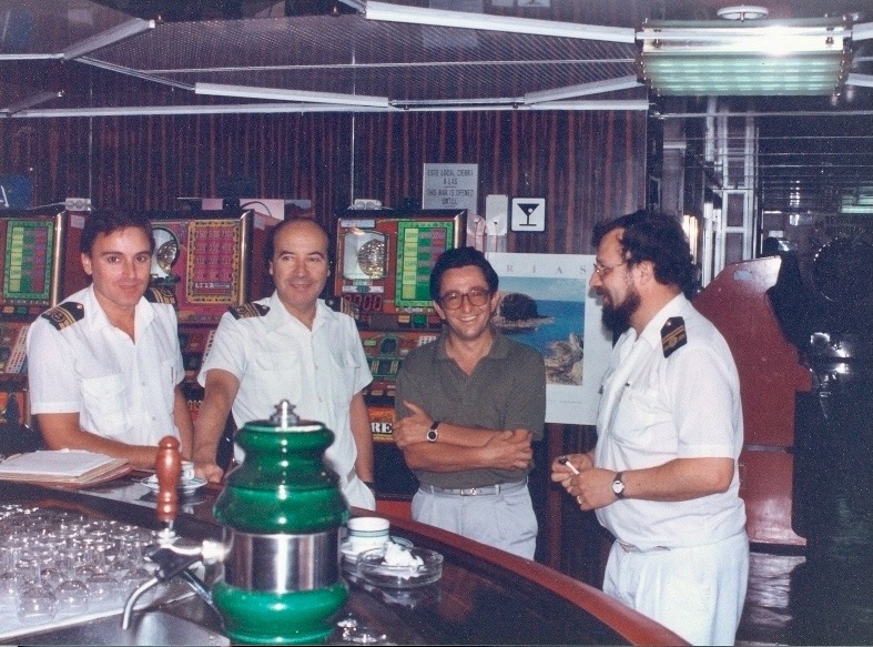 En la foto que acompaña, a bordo del ferry “Ciudad de Santa Cruz de La Palma”, en viaje de Santa Cruz de Tenerife a Sevilla (agosto de 1992). De izquierda a derecha: Carlos Gómez Verges, primer oficial de puente; Francisco Font Betanzos, capitán; Jesús Salgado Álvarez, jefe de prensa de Trasmediterránea; e Ignacio Escarda Salgado, oficial sobrecargo.