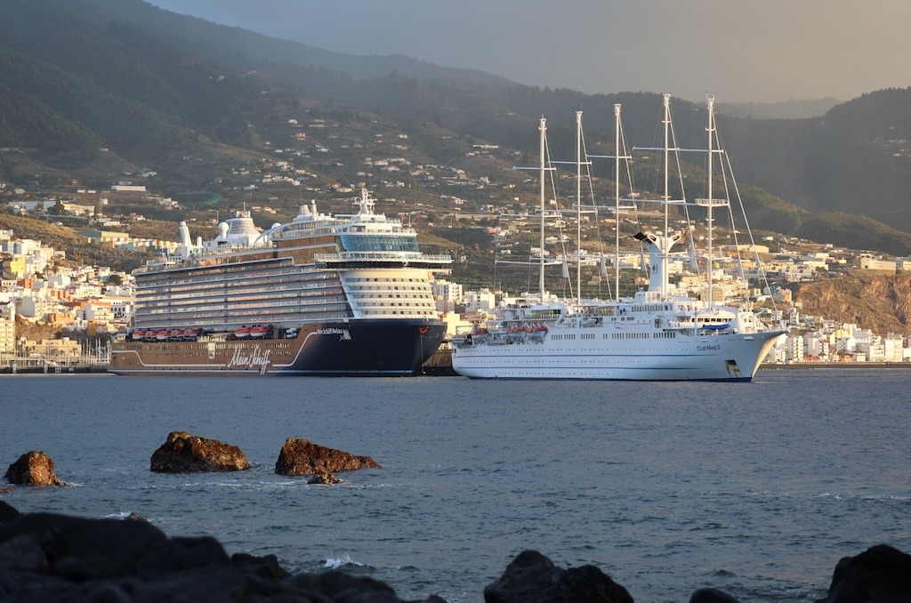 El puerto de Santa Cruz de La Palma recibe hoy la primera escala del nuevo buque “Mein Schiff Relax” (IMO 9862657), que realiza su primer itinerario de invierno entre Canarias y Madeira. El fotógrafo palmero José Ayut González, colaborador de puentedemando.com, ha captado la llegada del nuevo buque, al que se suma el buque de ultralujo francés “Club Med 2”. Durante unas horas, la mayoría de la expedición turística visita el centro histórico de la capital palmera y otros realizan excursiones programadas a bordo por el sur y el norte de la isla.