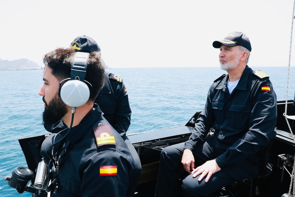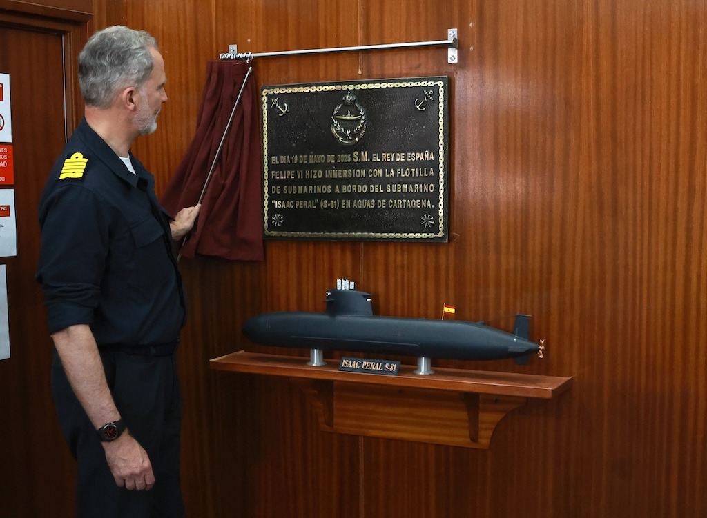 Tras el atraque en la fosa de la Base de Submarinos y el desembarque, el Rey se ha traslado al edificio principal donde ha descubierto una placa conmemorativa del primer embarque de Su Majestad el Rey en un submarino, que ha puesto fin a su visita al Arsenal Militar de Cartagena.