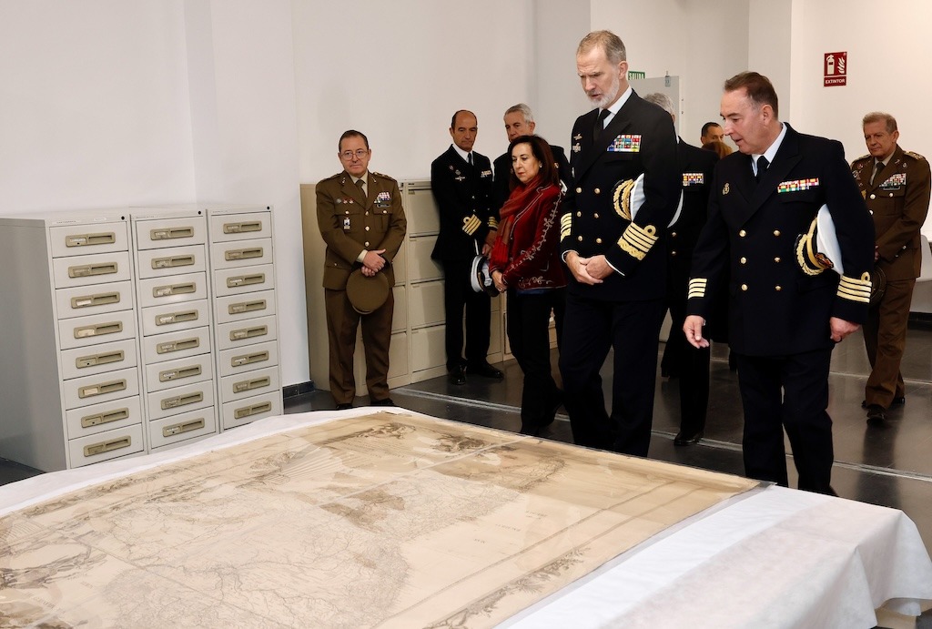 Felipe VI inició su visita acompañado por el director del Archivo Histórico y guiado por María del Pilar del Campo Hernán, directora técnica del centro, recorriendo las siguientes instalaciones: