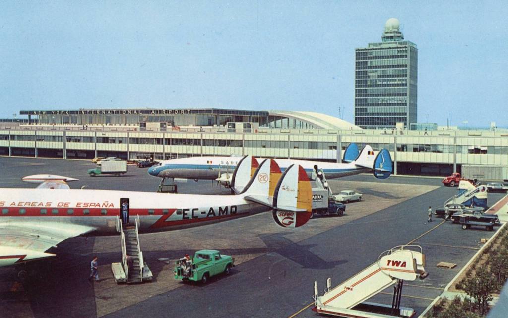 El 3 de agosto de 1954, Iberia inauguró la línea Madrid-Nueva York, haciendo un vuelo de presentación con el novedoso Lockheed 1049-C “Super Constellation” en el que viajaron 53 invitados, entre los que figuraba el presidente del INI, el presidente de Iberia, representantes de los ministerios del Aire, Turismo y Sanidad, Correos, así como otras personalidades de la Administración y un grupo de periodistas. El primer vuelo, con escalas en Azores y Bermudas, estuvo tripulado por los comandantes Cecilio Imaz y Hermenegildo Menéndez.