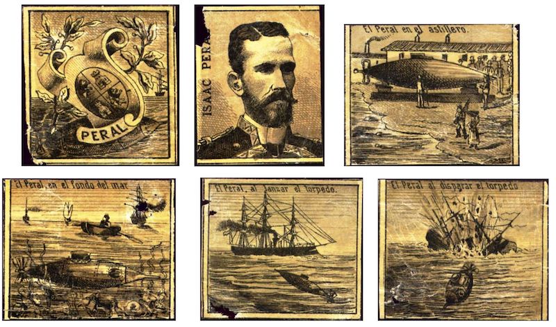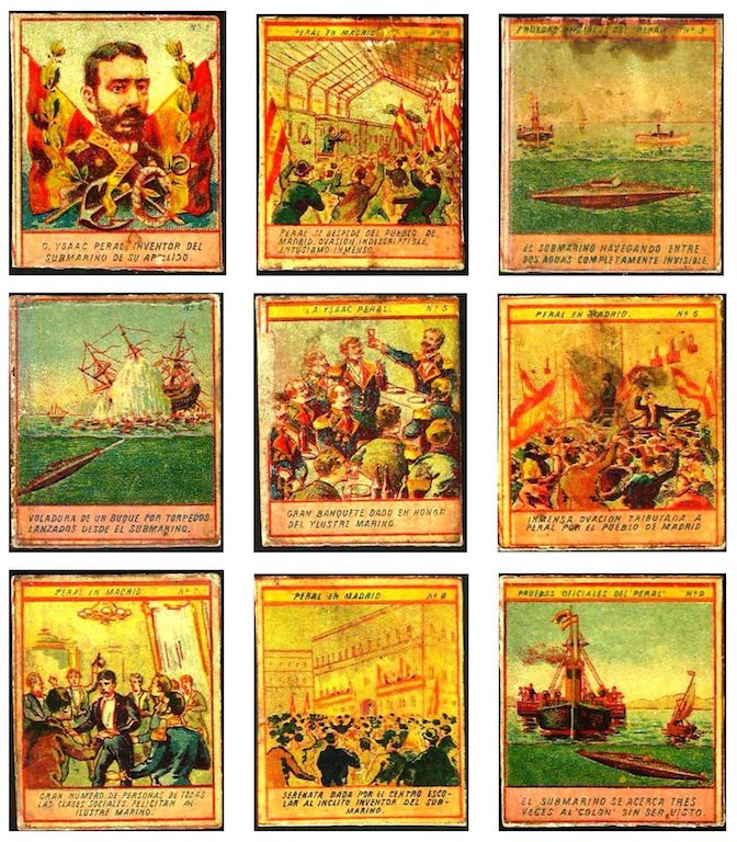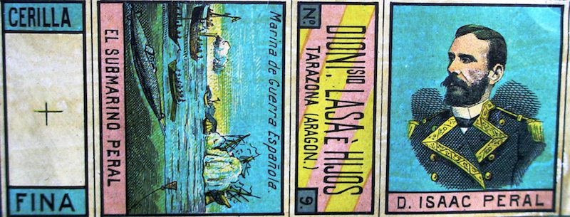 Así, el hecho de recortar los frontales, generalmente de cartón más o menos rígido, y archivarlos, proporcionaba una gran dosis de cultura, arte o sabiduría a quien lo hacía, no pudiendo faltar entre todos los eventos dignos de ser inmortalizados en las cajas de cerillas españolas de finales del XIX, todo lo concerniente al submarino Peral, pues no sólo quedaron reflejados el proceso de construcción, puesta a flote, pruebas de mar, lanzamiento de torpedos, etc., sino cualquier cosa que tuviera relación con invento o inventor, que iban desde dejar constancia de los homenajes que Isaac Peral recibiría en la capital de España, la representación del escudo de su apellido, o la imagen no solo suya sino también las de los oficiales de la mítica dotación del primer submarino torpedero de la historia.