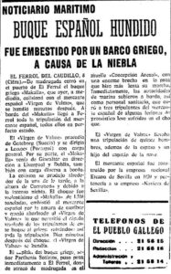 Una avería en el radar impidió advertir la presencia del buque griego “Makalla” —capitán, Sotirios Parthenis, IMO 5174399—, que según la información del capitán Rafael Suárez Jáuregui no hizo sonar las señales fónicas en caso de niebla en viaje de Orán a Dublín, que lo abordó por la amura de estribor a las 12:50 horas y el buque español se hundió en 18 minutos.