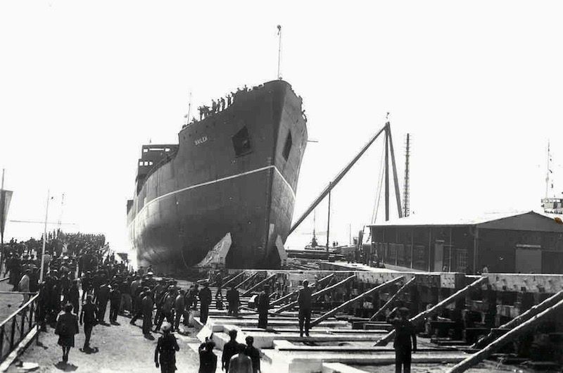 En plena guerra mundial, con la industria naval española sufriendo vicisitudes de todo tipo en cuanto al abastecimiento de materiales y restricciones eléctricas, así como las penurias derivadas de la reciente guerra civil, la quilla del nuevo buque, construcción número 72 del astillero de Matagorda, se colocó el 14 de diciembre de 1942 y hasta su botadura transcurrirían casi cuatro años. El 4 de abril de 1946 resbaló por la grada con el ceremonial acostumbrado y el 3 de julio de 1947 se procedió a su entrega oficial.