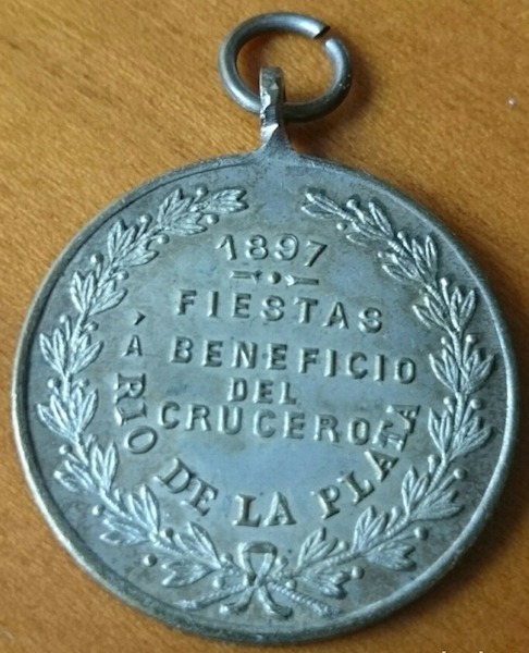En el anverso de dicha medalla –de pequeño tamaño, sólo 28 m/m lo que propiciaba utilizarla como adorno en un collar o pulsera–, se representaba la silueta del aún nonato crucero visto por su amura/través de estribor, coronado por la leyenda ASOCIACIÓN PATRIÓTICA ESPAÑOLA, mientras en el reverso, en bordura de laureles, podía leerse en renglones sucesivos que la misma era a beneficio de la construcción del citado crucero.