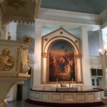 En sus primeros años, detrás del altar existió una cruz de madera dorada sobre un fondo azul celestre, diseñada por el arquitecto Engel. En 1854, el Sínodo adquirió el retablo que admiramos en la actualidad, obra del pintor de la Corte Robert Wilhelm Ekman, en el que muestra a Jesús bendiciendo a los niños. Esta pintura fue encargada originalmente para la catedral de Helsinki, pero el representante del zar no la consideró adecuada para el destino propuesto.