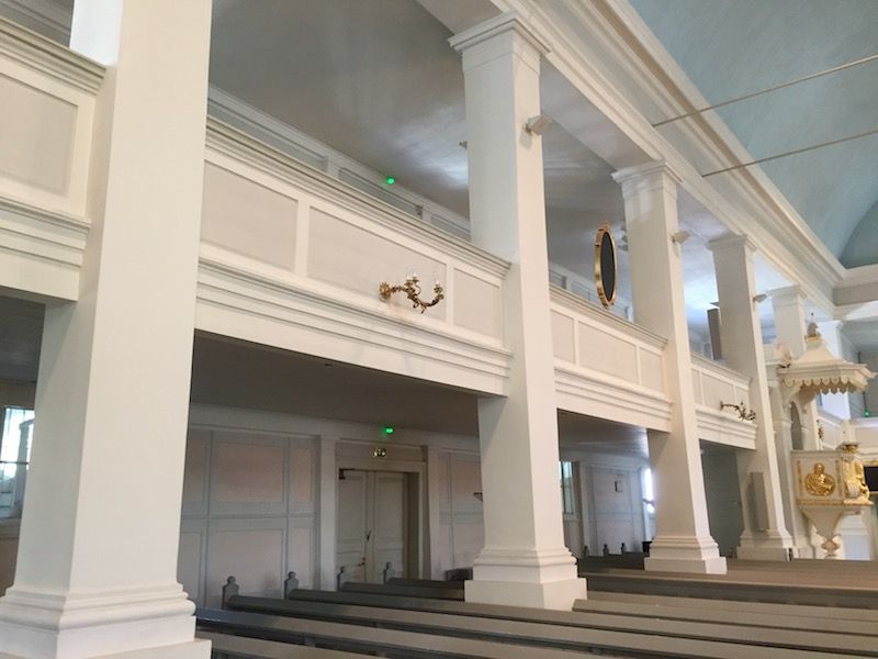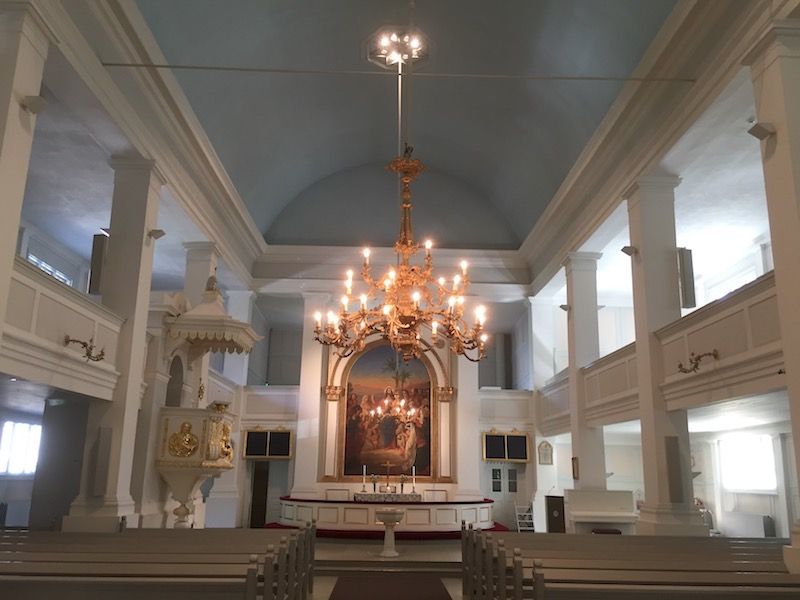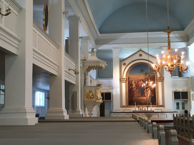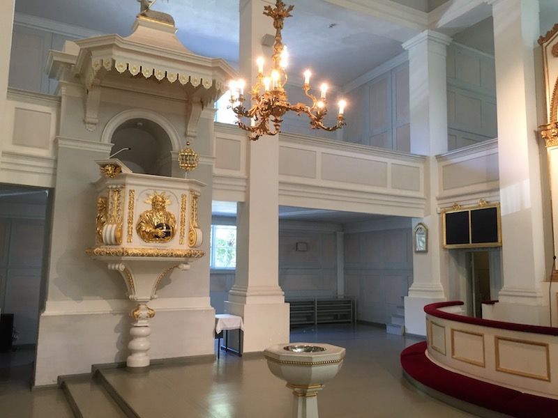 De planta de cruz griega, la Iglesia Vieja tiene un aforo para 1.200 personas distribuidas en dos pisos y toda ella está construida utilizando grandes troncos de madera. Las obras dieron comienzo en 1824 y fue consagrada el 17 de diciembre de 1826 por el deán Johanm Borgström. La puerta lateral que linda con el parque data de 1828.