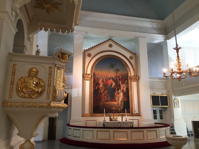 En sus primeros años, detrás del altar existió una cruz de madera dorada sobre un fondo azul celestre, diseñada por el arquitecto Engel. En 1854, el Sínodo adquirió el retablo que admiramos en la actualidad, obra del pintor de la Corte Robert Wilhelm Ekman, en el que muestra a Jesús bendiciendo a los niños. Esta pintura fue encargada originalmente para la catedral de Helsinki, pero el representante del zar no la consideró adecuada para el destino propuesto.