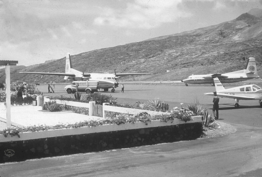 A la primera etapa del actual aeropuerto de La Palma pertenece esta imagen de la primera terminal procedente del archivo de Antonio Barbero García, en la que vemos a dos aviones Fokker F-27 de la gran Iberia, así como una avioneta Piper en el ángulo derecho, que pudiera ser la avioneta Piper del Aeroclub de La Palma, de la que milagrosamente escapó con vida Antonio Carrillo Kábana cuando cayó al agua poco después del despegue.