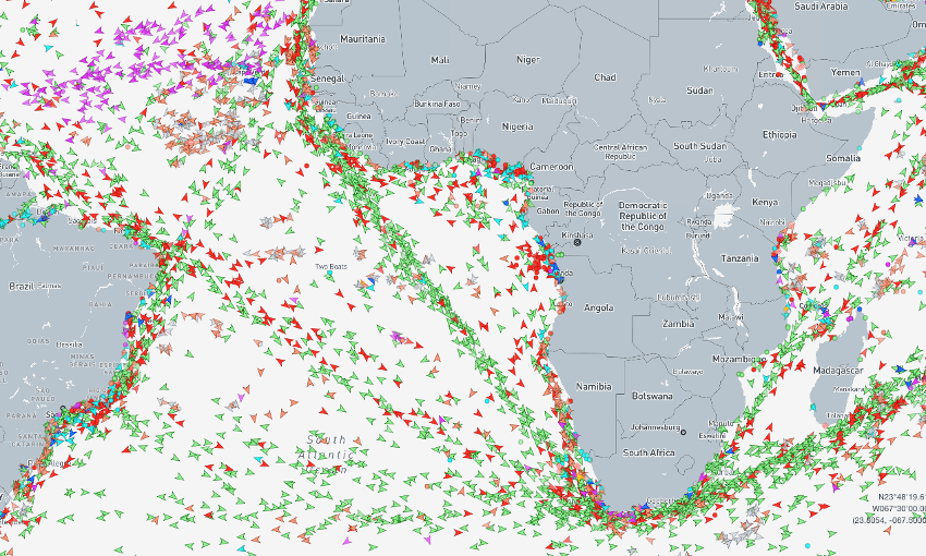 En la imagen AIS anterior, se aprecia con claridad la tendencia actual de los navíos de bordear el Cabo de Buena Esperanza, tras la intensificación de los ataques a los buques que transitan el Mar Rojo rumbo al Canal de Suez. Maersk, MSC, Hapag Lloyd, Wallenius Wilhelmsen, entre otras, están eludiendo la ruta arábica. Este cambio implica entre dos y cuatro semanas más de navegación, para lo que anteriormente ya suponían 40 días. Unos 19.000 barcos al año se pueden ver afectados por este desvío. Otros buques esperan fondeados o atracados al este del Golfo de Adén o al norte del Canal del de Suez, a que la situación mejore. Independientemente de los portacontenedores, la ruta a través del Mar Rojo es esencial para los petroleros que transportan crudo.