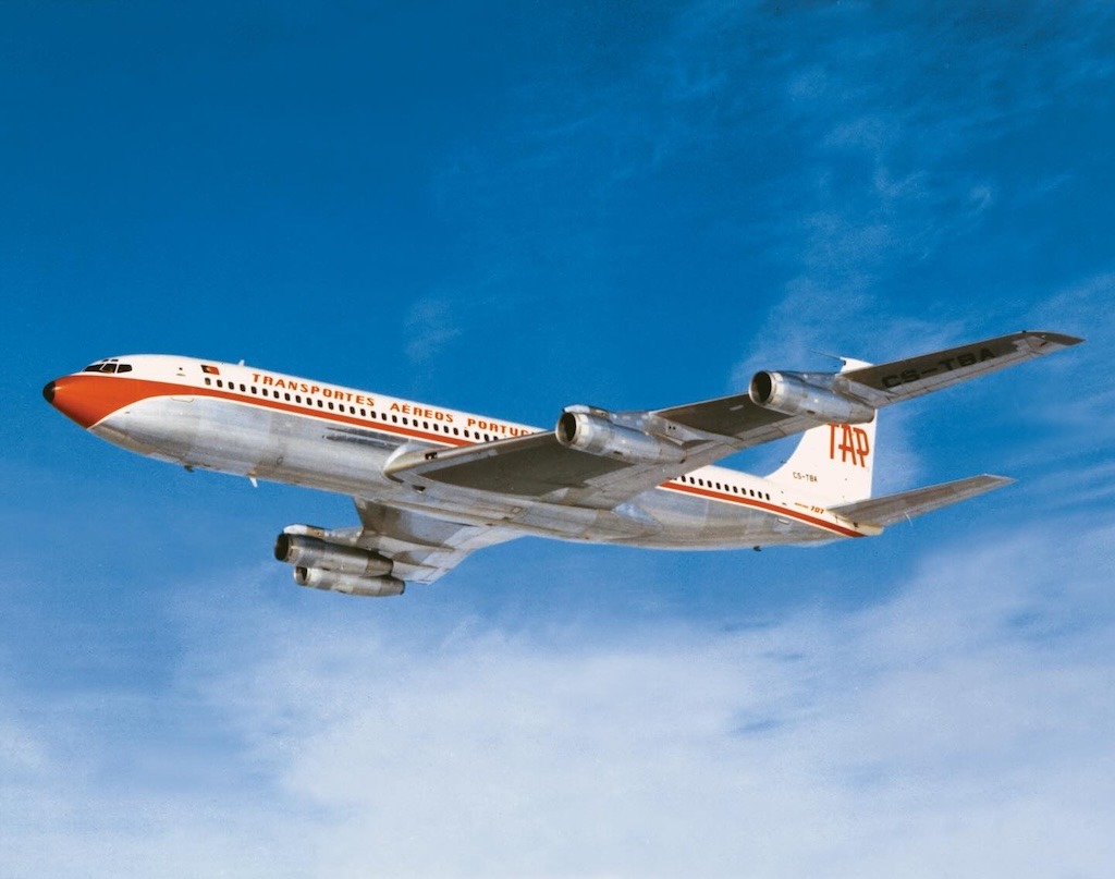 Entre aquellas compañías que cuidaba la edición de postales a color figuraba la portuguesa TAP y esta imagen de su mítico avión Boeing B-707, quizás el más elegante de los reactores de primera generación, que competía abiertamente con el legendario Douglas DC-8.