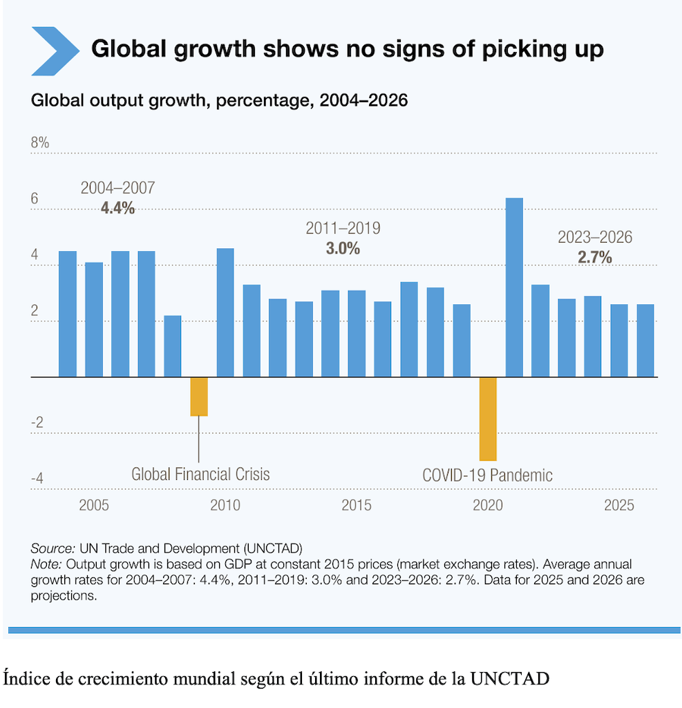El reciente “Informe sobre el Comercio y el Desarrollo 2025: Al borde del abismo”, elaborado por la UNCTAD, advierte que la economía global se encuentra en una situación de creciente fragilidad debido al endurecimiento de las condiciones financieras y a la elevada incertidumbre geopolítica. Según el documento, el crecimiento mundial se desacelerará hasta el 2,6 % en 2025, frente al 2,9 % registrado en 2024, como consecuencia de la presión simultánea sobre el comercio y la inversión internacionales.