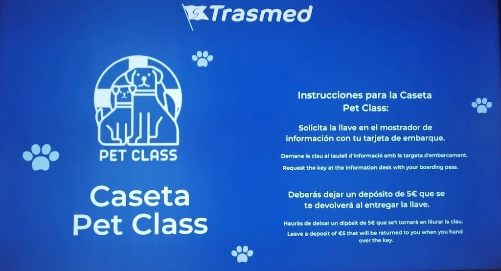 Las casetas disponen de un servicio de videovigilancia. Para acceder a la cámara hay que entrar mediante usuario y contraseña en una web de Trasmed especialmente habilitada. En el momento del embarque, a bordo en recepción facilitarán al pasajero la información precisa. Este servicio está disponible conectado a la wi-fi gratuita del barco. En el exterior hay un espacio acotado y señalizado para dar un paseo. Observamos un nivel de limpieza y orden francamente aceptable. El mensaje exterior de Pet Class resulta elocuente: “Aquí, nuestros amigos peludos viajan de primera”.