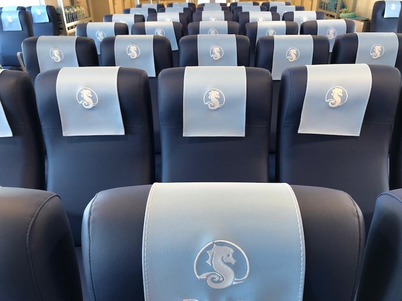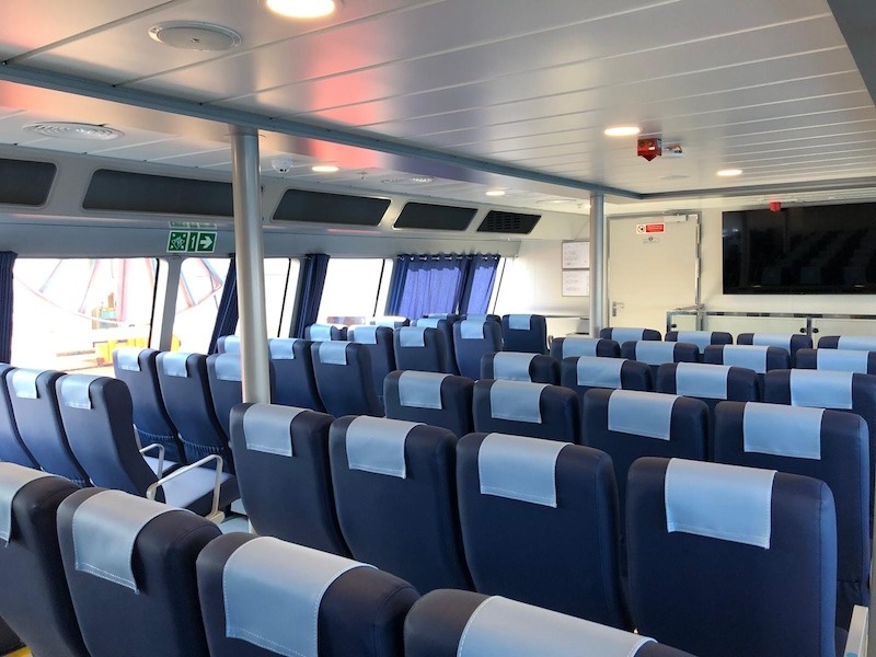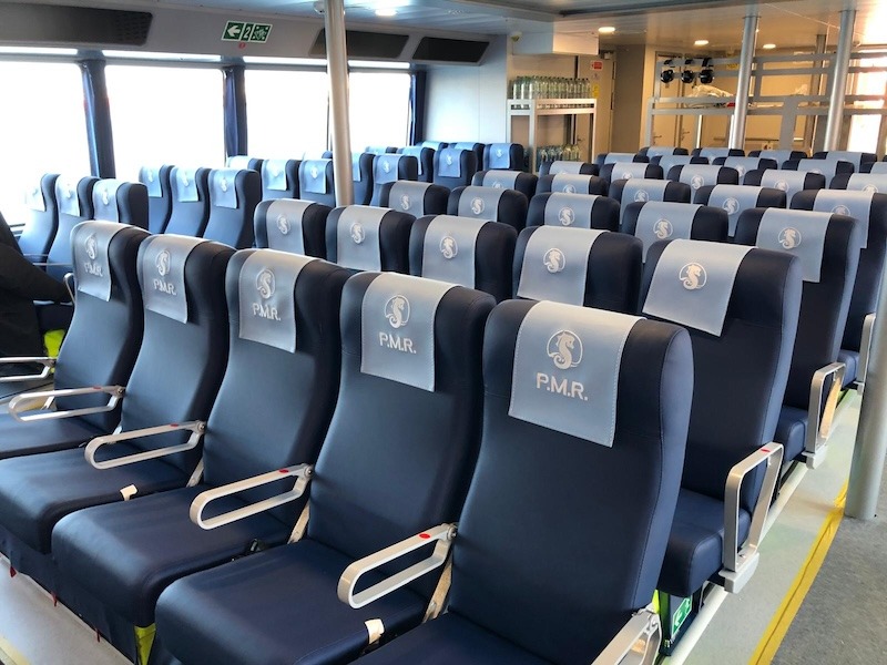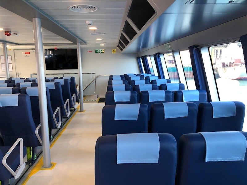 El pasaje se distribuye en dos cubiertas comunicadas por una escalera interior. Se trata de espacios funcionales con un número suficiente de servicios, incluidos PMR. Los asientos están forrados en materiales especiales que cumplen no solo con la normativa ignífuga, sino también con calidades superiores para un alto rendimiento considerando el elevado número de pasajeros. Asimismo, dispone de armarios superiores portaequipajes de mano y un pequeño bar-cafetería.