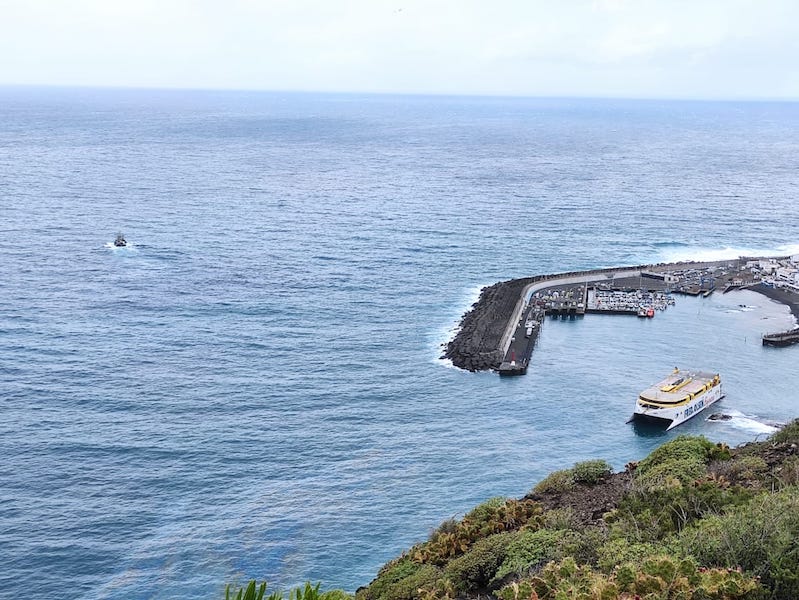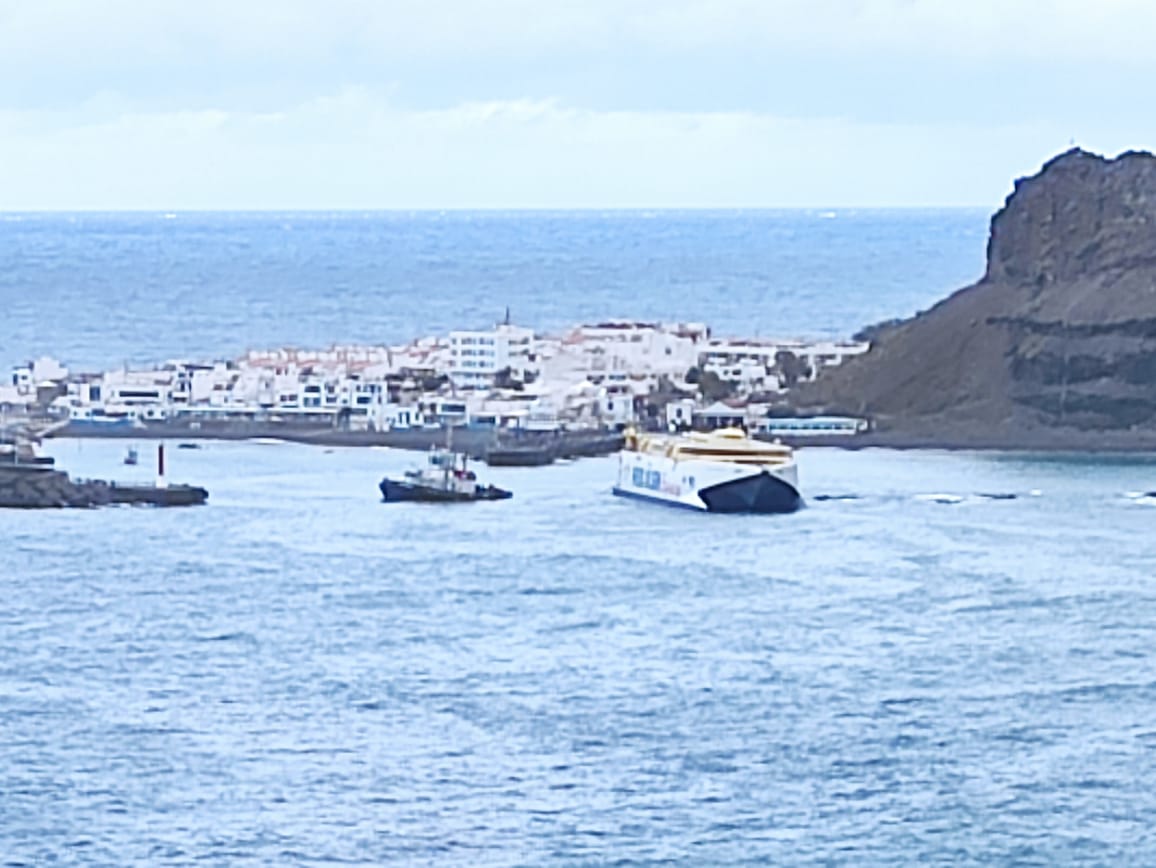 Se aprecia una escora en el catamarán “Bentago Express” y el casco de babor está empotrado en el bajo de Las Merinas, según señalan fuentes conocedoras de la situación. Se ha producido un vertido de gasoil, que es probable desaparezca en las próximas horas por la acción de la marea.